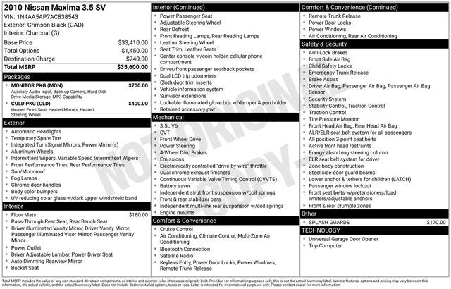 This 2010 Nissan Maxima 3.5 SV is a well-equipped, stylish sedan that offers an exceptional value. Under the hood, you'll find a powerful 3.5L V6 DOHC 24V engine paired with a smooth-shifting CVT transmission, delivering an impressive 19 city/26 highway MPG.